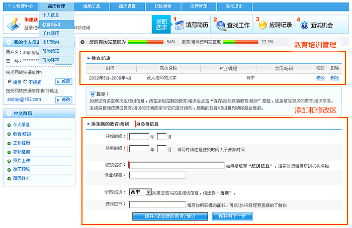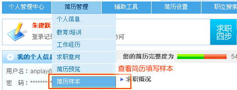 在此功能分支下有 个人信息、教育培训、工作经历、求职意向、简历预览、简历样本等子功能项