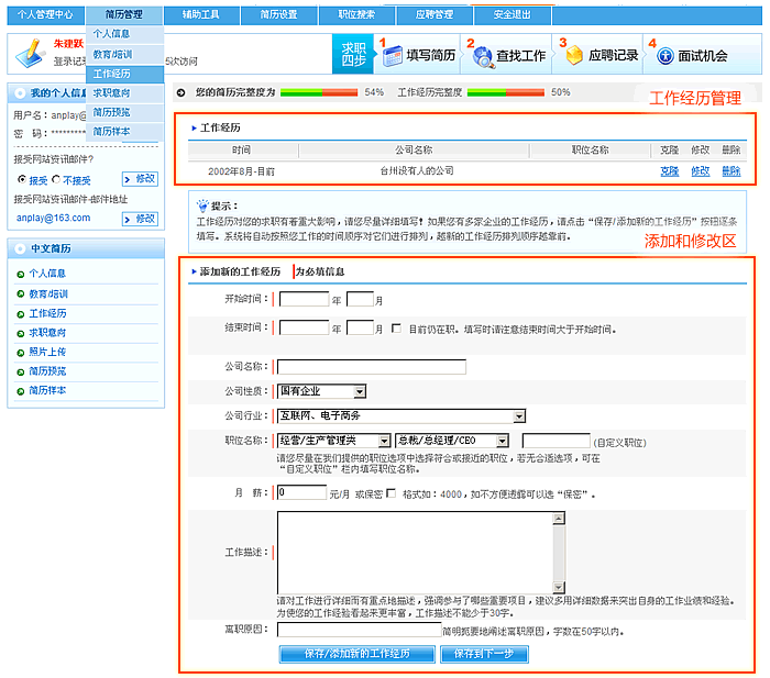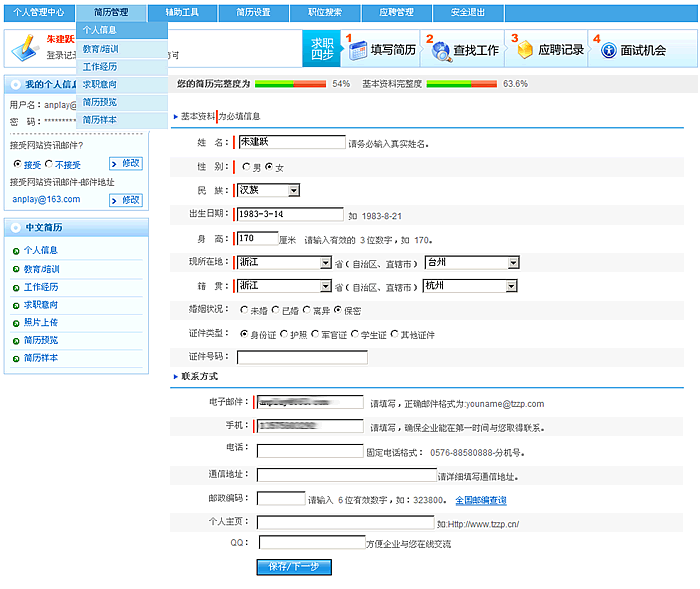 完整的个人信息作为求职者是很重要的,否则公司企业将无法与您取得联系," |"为必填项;简历完整度越高越好