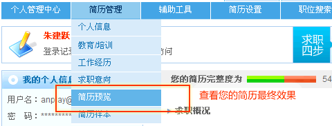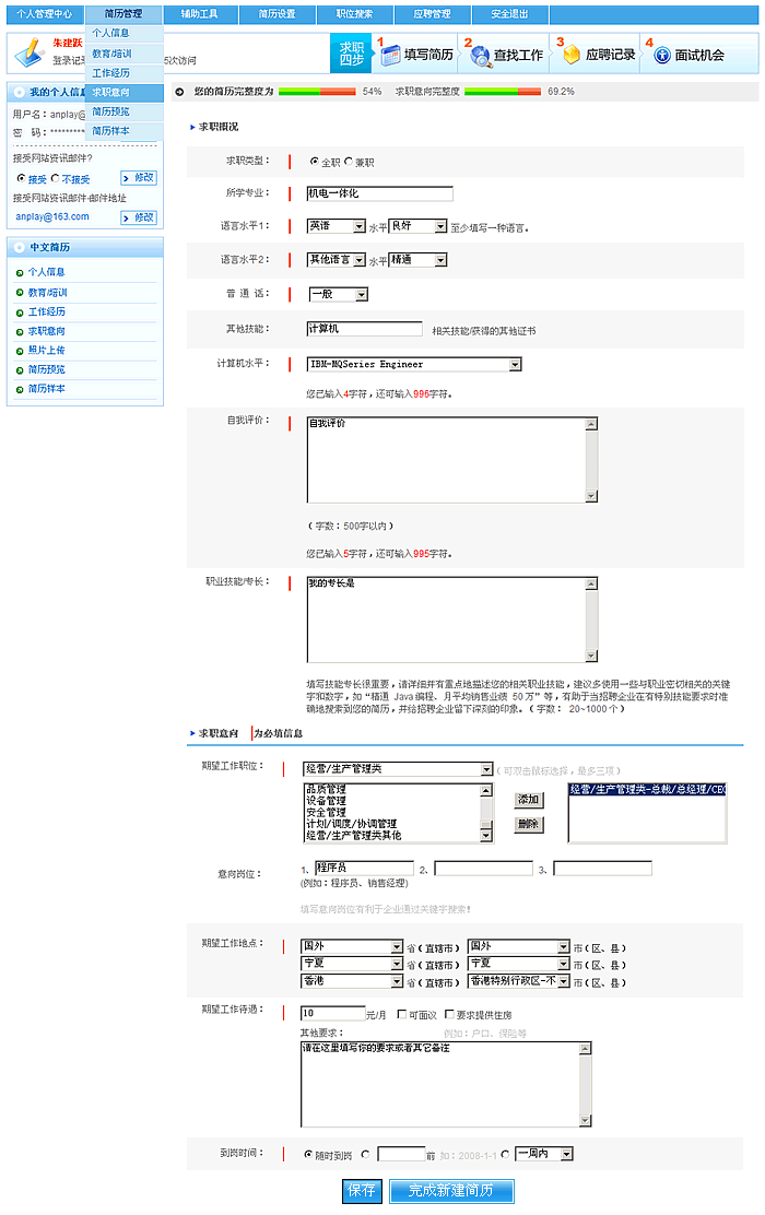 求职概况主是填写您的职业技能和自我评价,求职意向包括工作地点,工作薪水,工作种类等选项